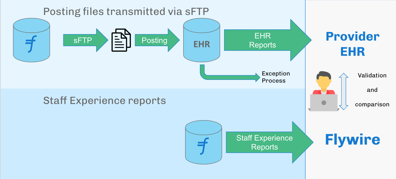 Once a payment transaction is recorded in Flywire, at the end of each day, Flywire automatically generates a posting file to send back to the EHR in the form of a flat file or a text file.