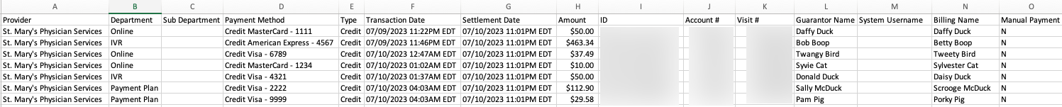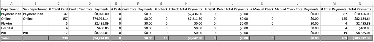 Here's an example of the Payments Summary by Sub Department and Facility report: