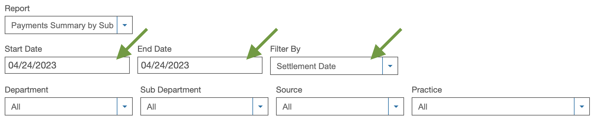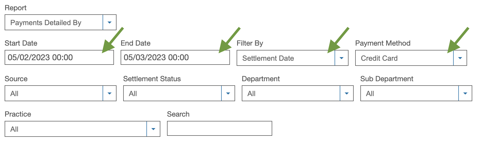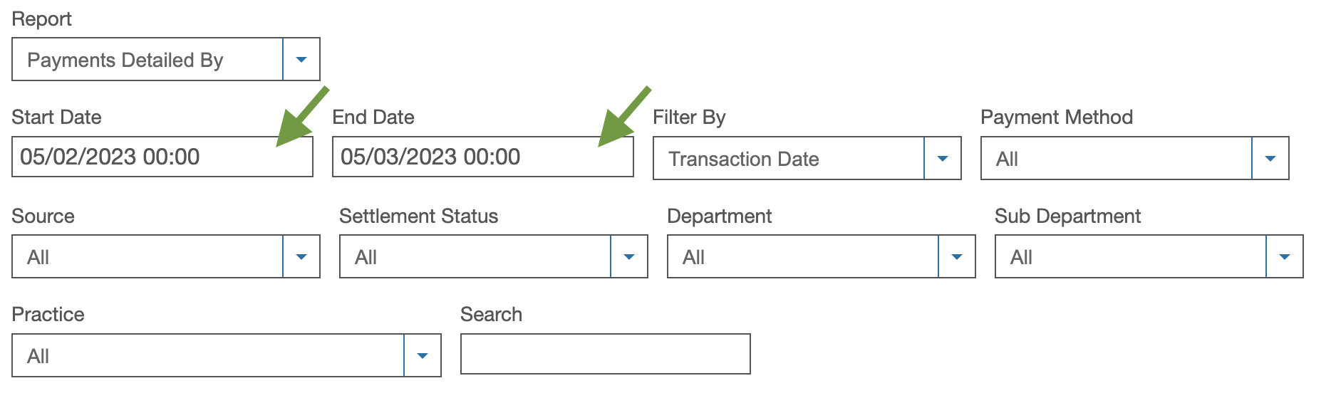 - NOTE: The time filter can be left as is (00:00) since transactions will settle at a specific time of day, you only need to select the calendar day of settlement.