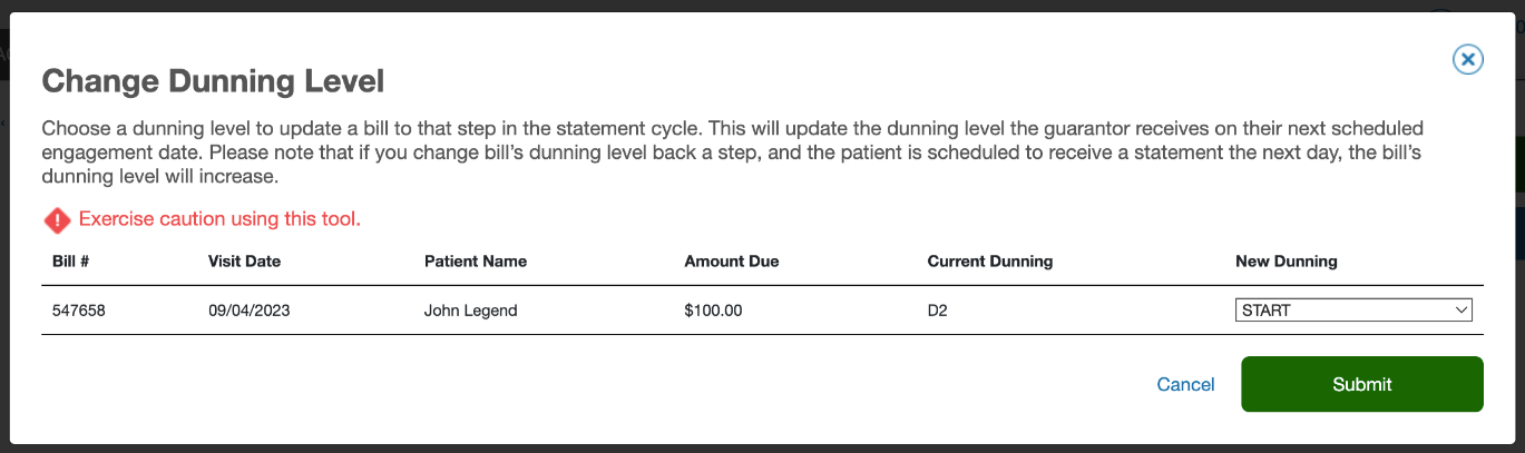 3. A pop up modal will appear with bills that are eligible to have their dunning level changed